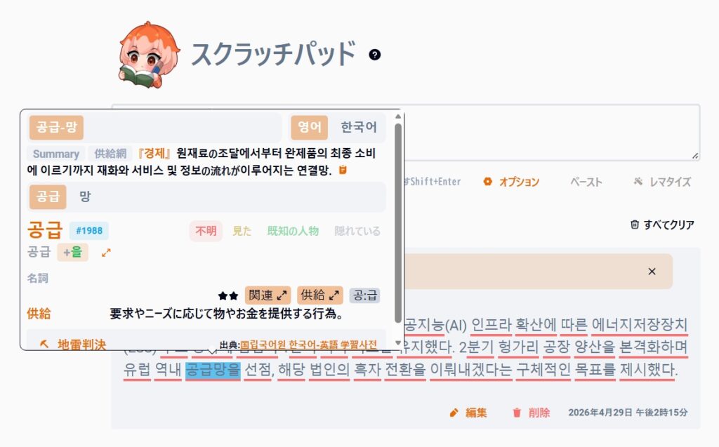 ブラウザの拡張機能やモバイルアプリを通じて、コンテンツ内の韓国語をクリックするだけで、即座に辞書定義や文法解説、漢字の情報を表示できます。