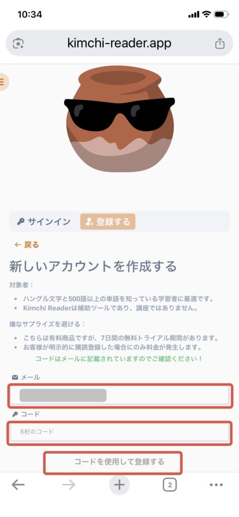④ 入力したメールにコード(数字)が送られてくるので、再度メールを入力、コードを入力して〈コードを使用して登録する〉をタップします。